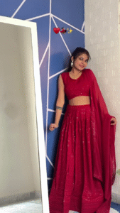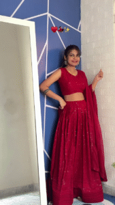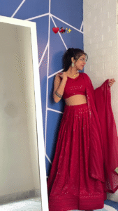 The lehenga features luxurious silk velvet fabric, known for its smooth texture and royal sheen. The vibrant red hue symbolizes love, prosperity, and timeless beauty — a color that has defined bridal heritage for generations. Moreover, the fully stitched silhouette ensures a perfect fit, saving you the stress of tailoring or last-minute adjustments.