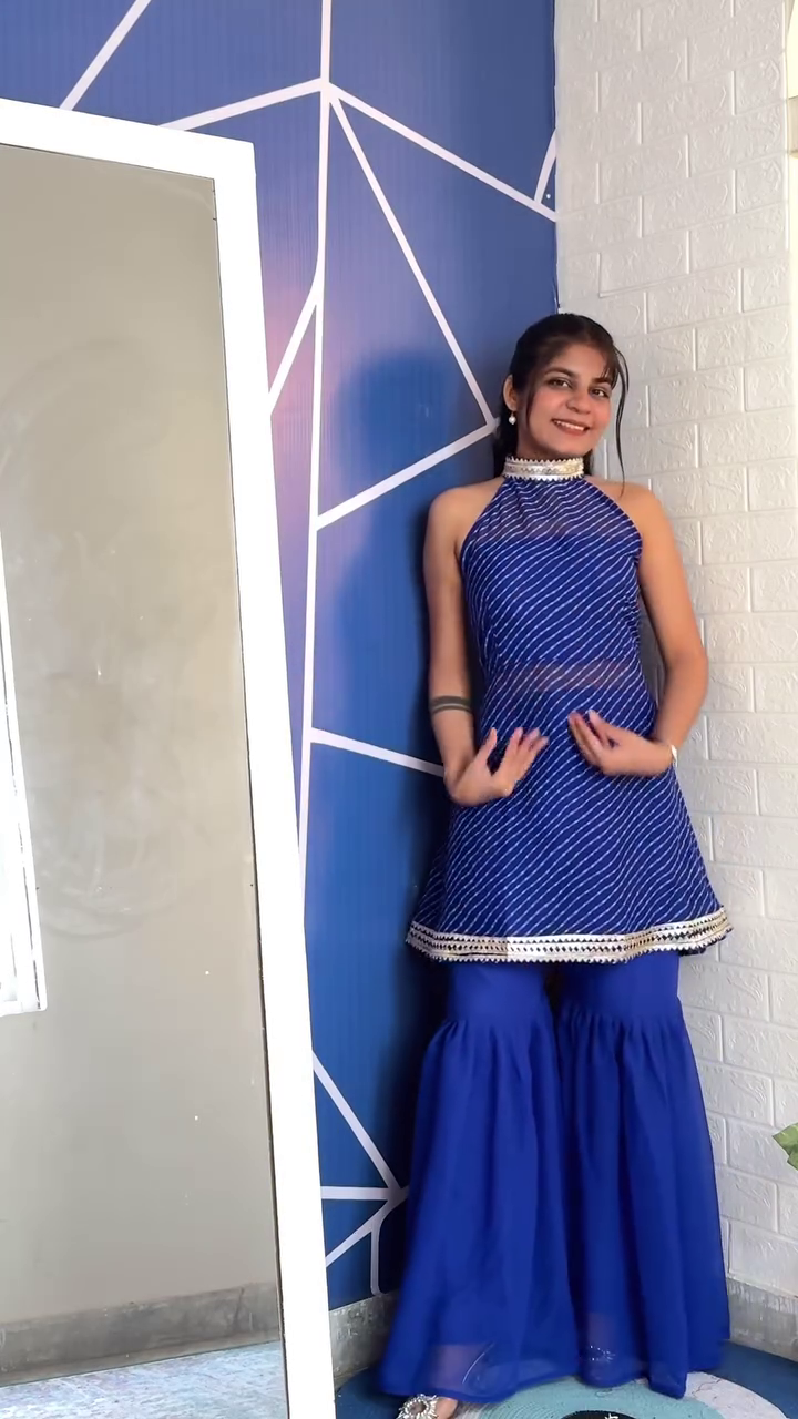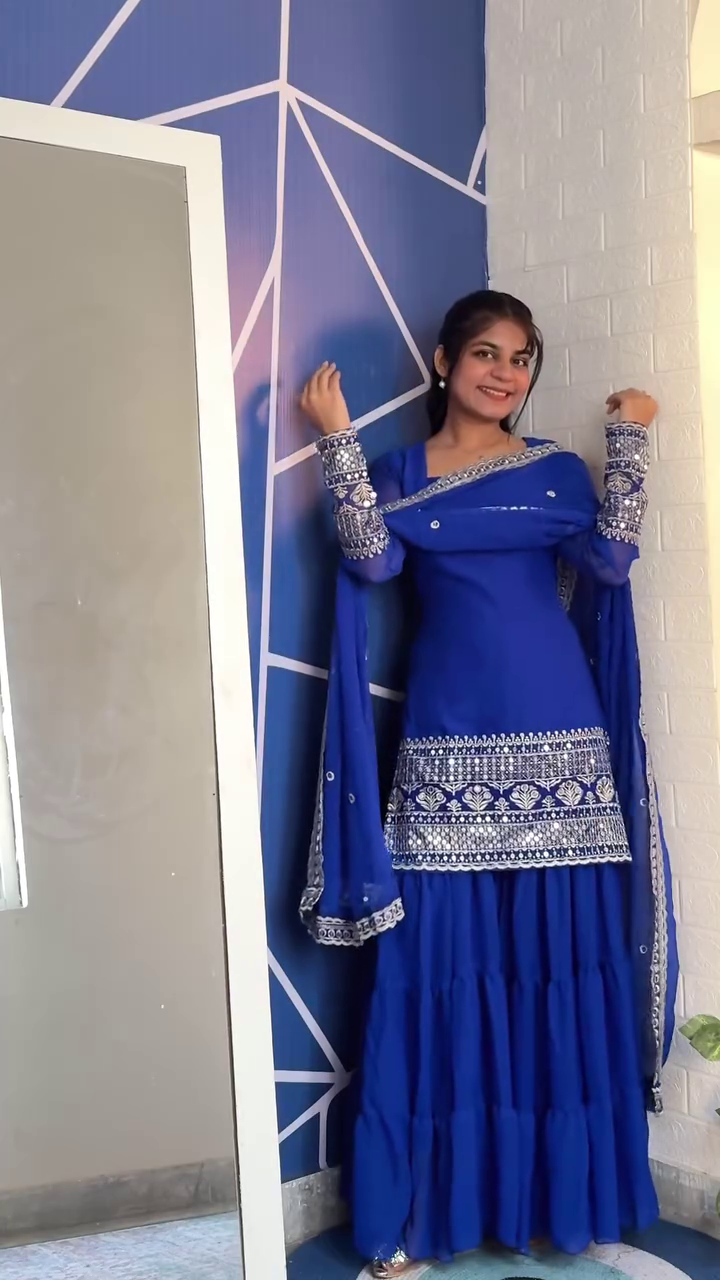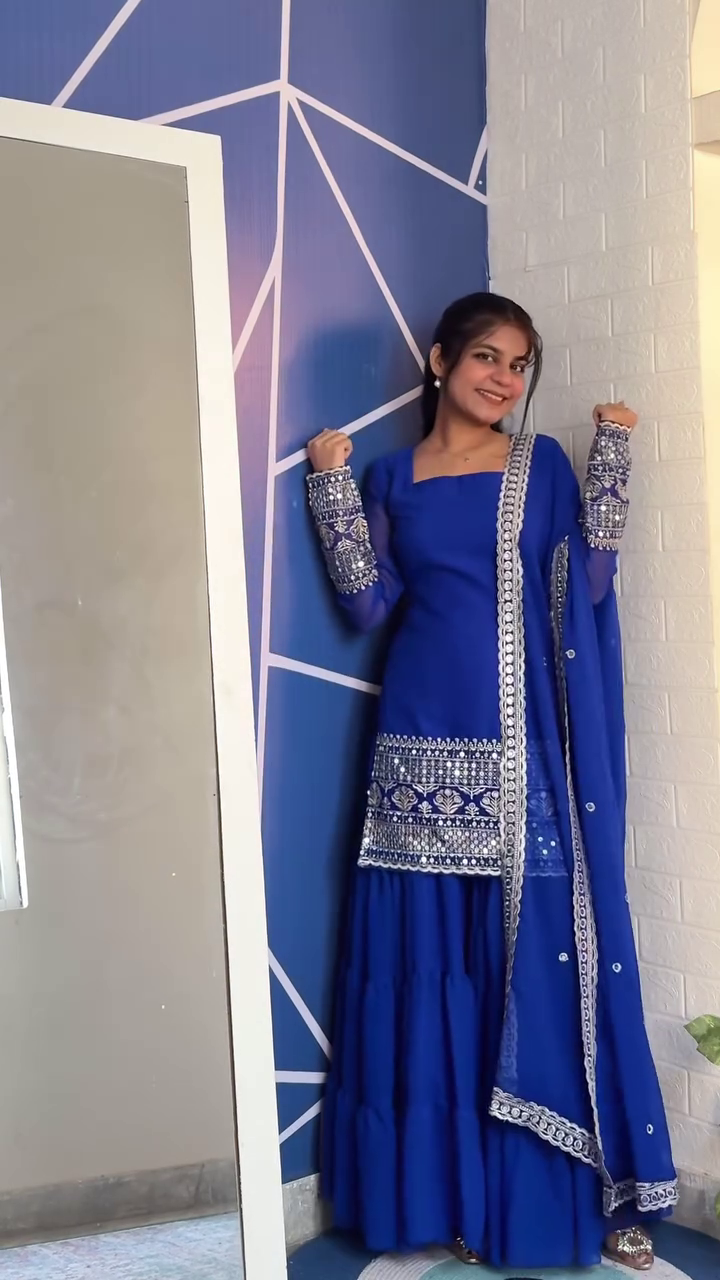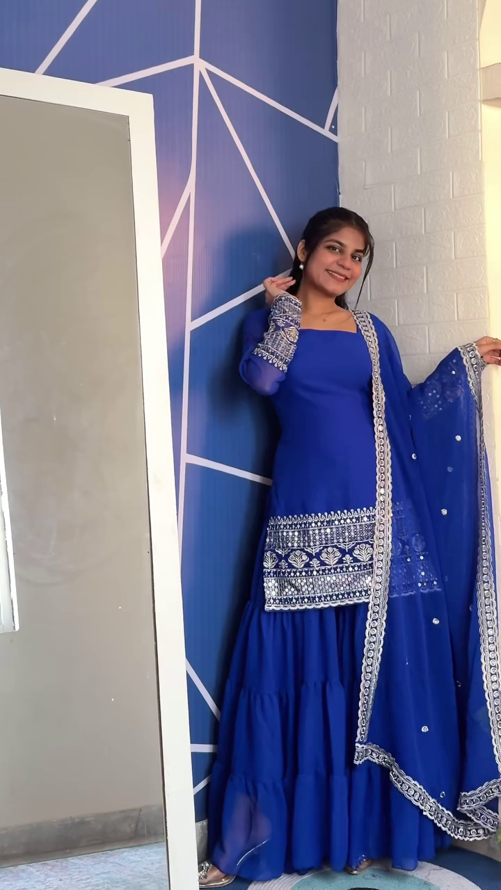 Step into the wedding season with timeless elegance in our Navy Blue Embroidered Georgette A-Line Sharara Suit Set — a stunning addition to your Shaadi Fits Haul. Designed to blend regal grace with modern comfort, this outfit celebrates traditional charm in a rich, flowy silhouette.