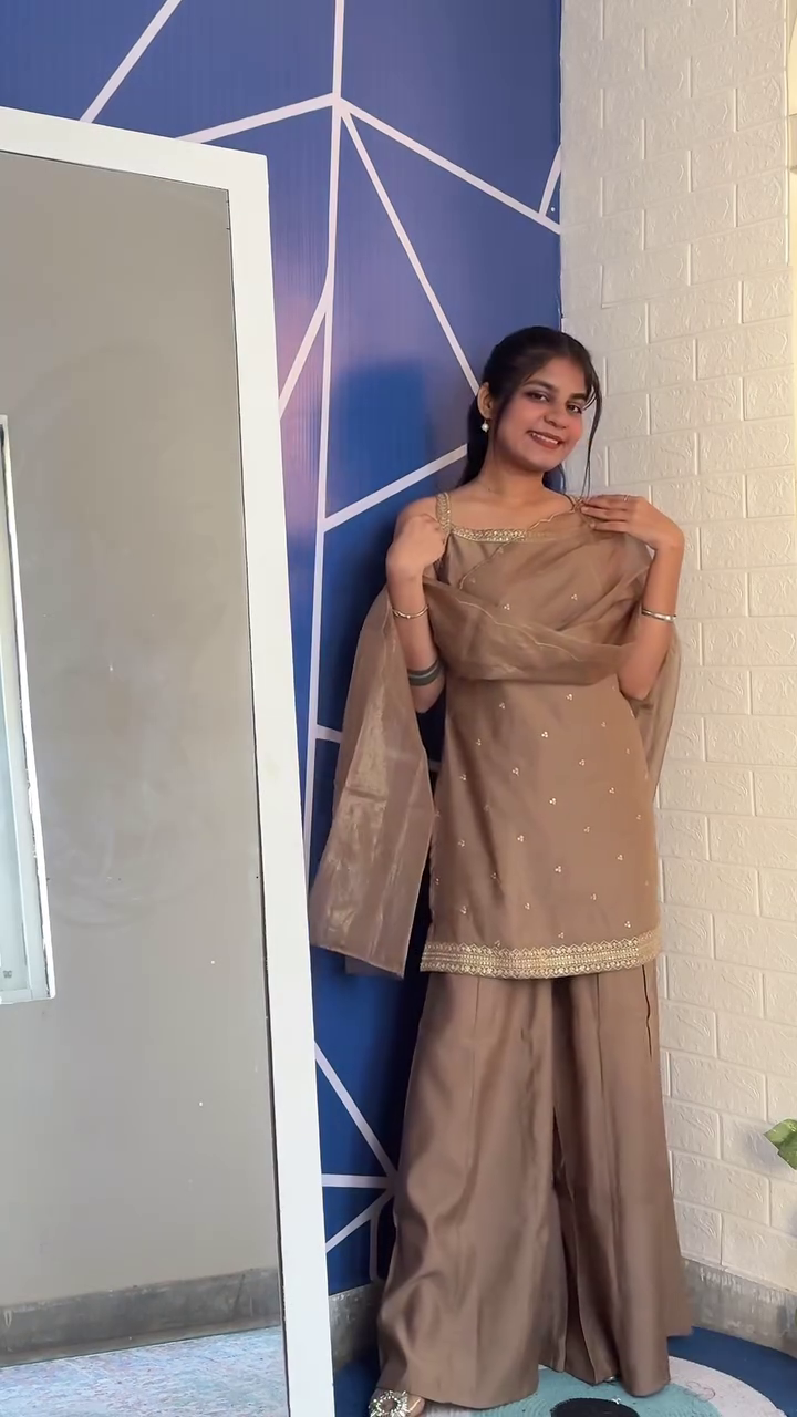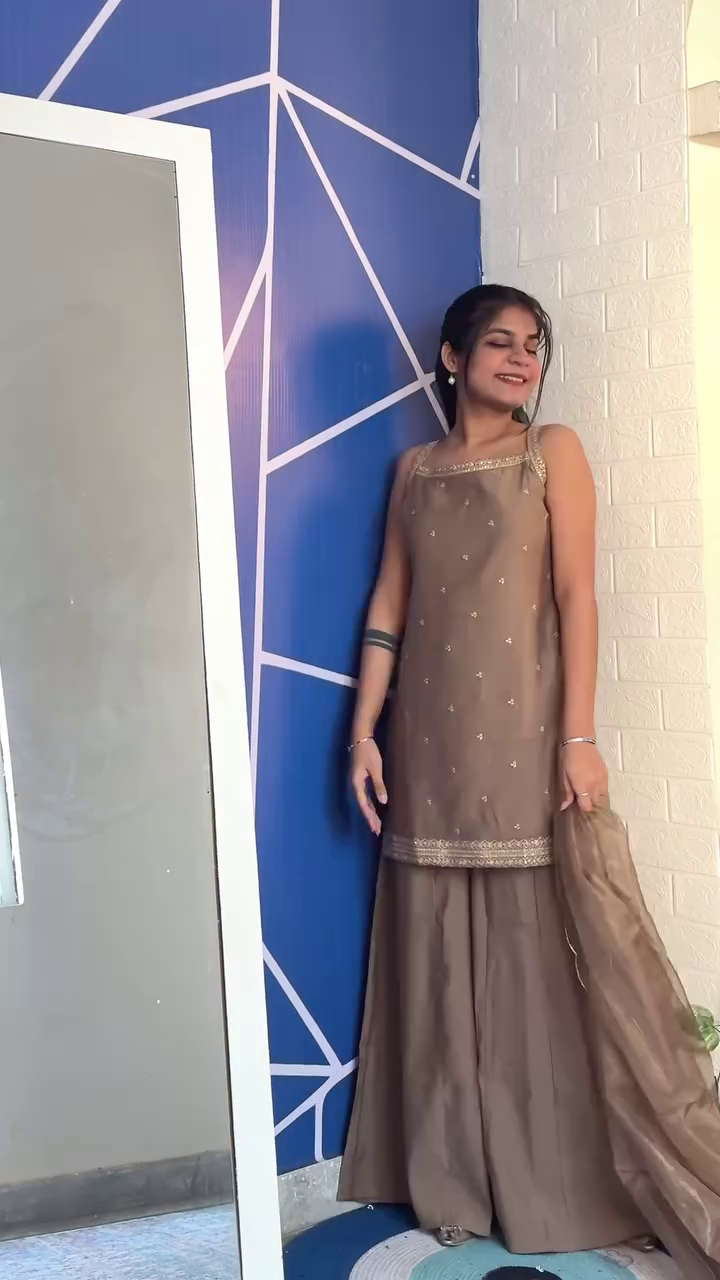 The A-line georgette kurta is adorned with delicate zari and thread embroidery, offering just the right sparkle for daytime functions or evening celebrations. The wide-legged sharara pants bring a touch of drama and sophistication, while ensuring ease of movement for dancing, photos, and long festive hours. Moreover, the soft matching dupatta with an embroidered border completes the look, adding a graceful and polished touch.