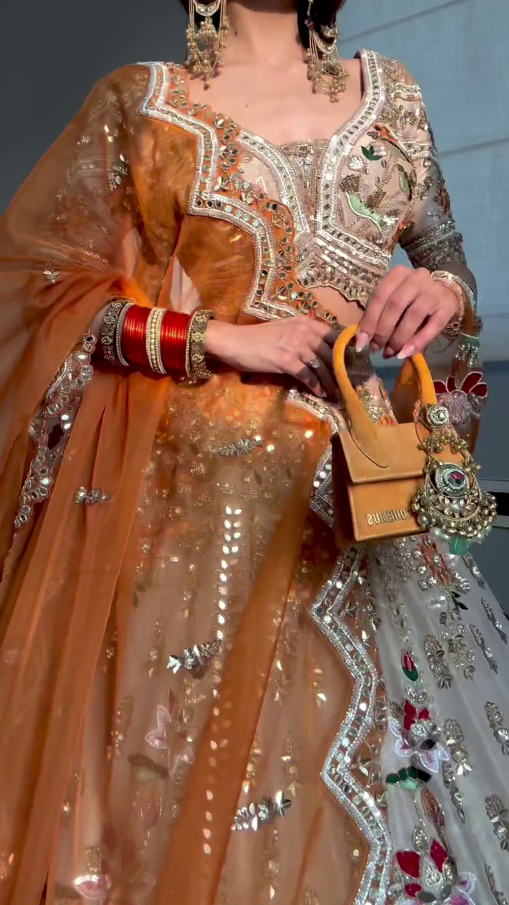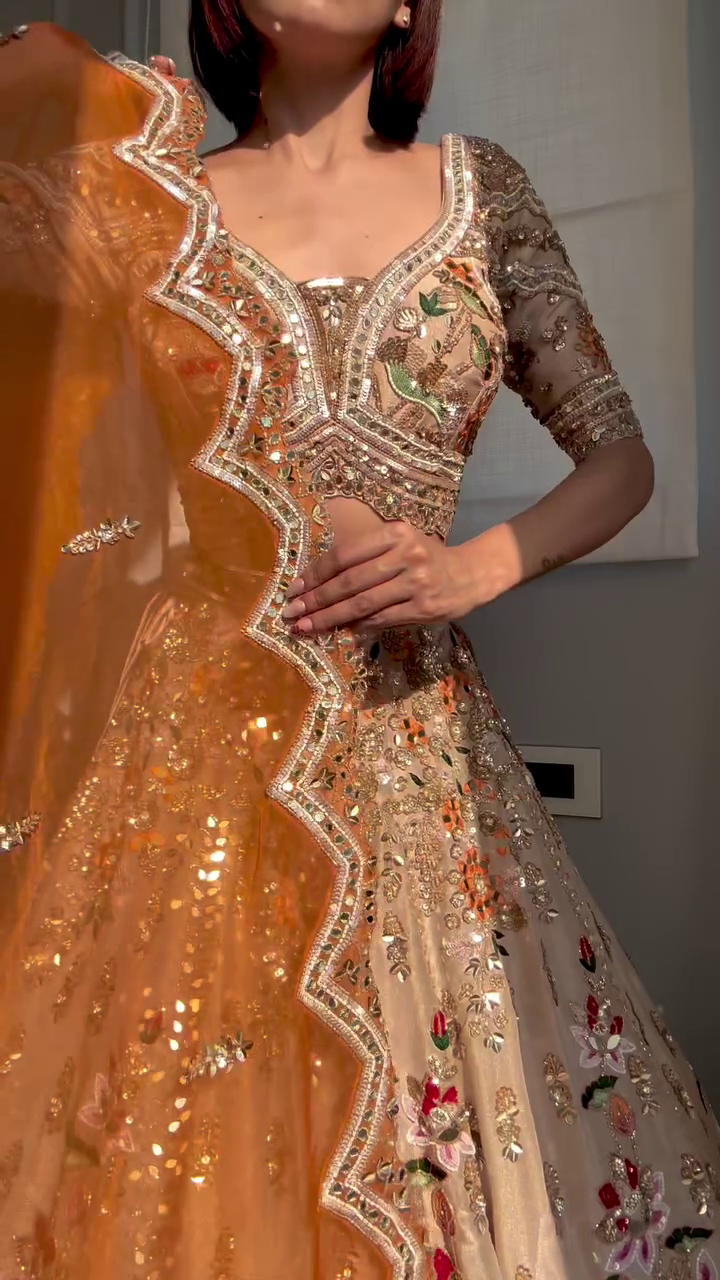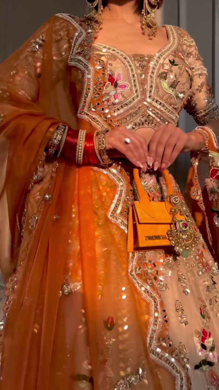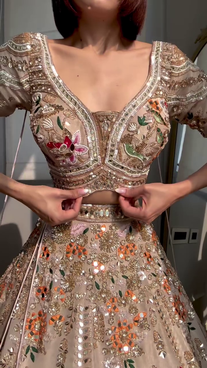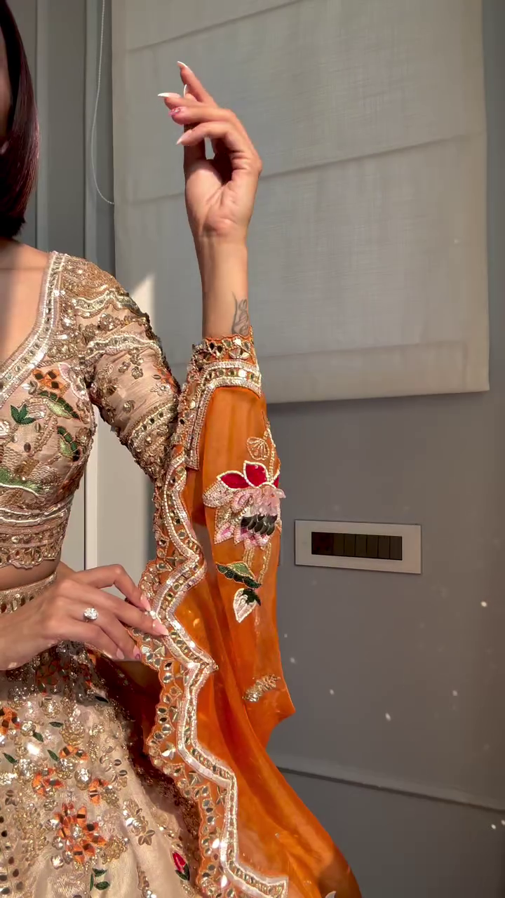 Each panel of this lehenga is brought to life with handcrafted mirror work, meticulously embedded across intricate zardozi and resham embroidery. The play of mirrors and threads creates a gentle sparkle that catches light from every angle, offering a mesmerizing shimmer during ceremonies or evening receptions.