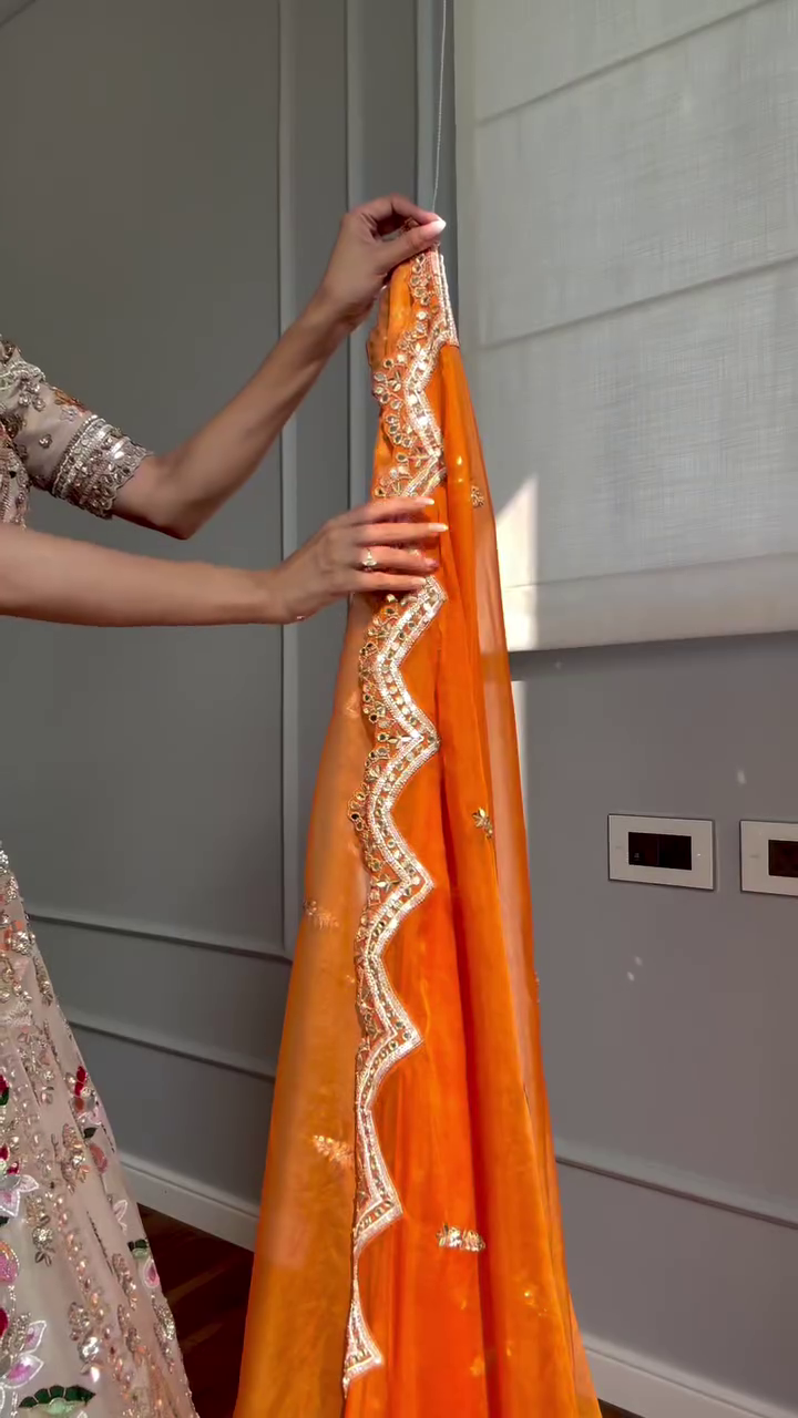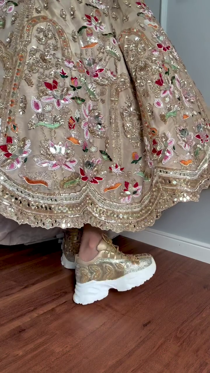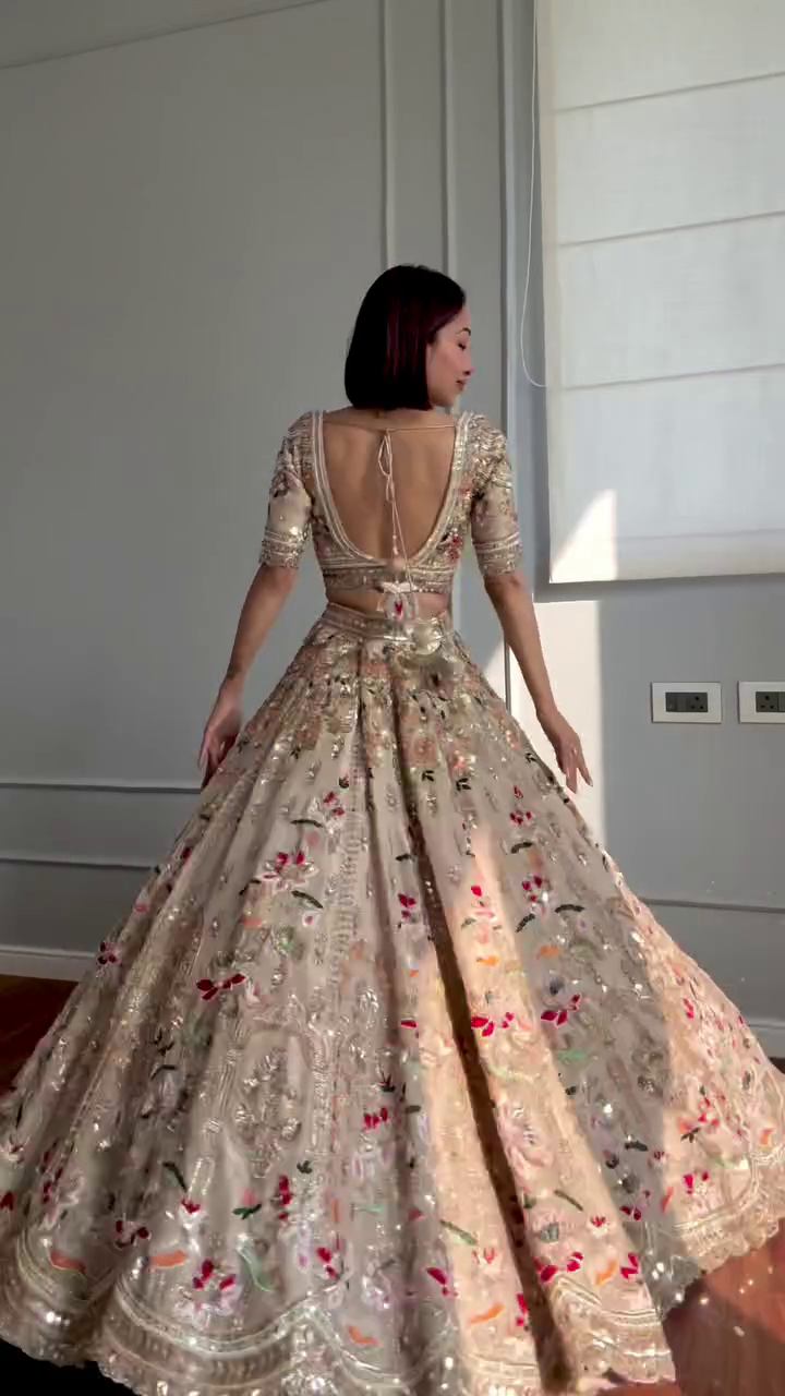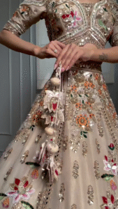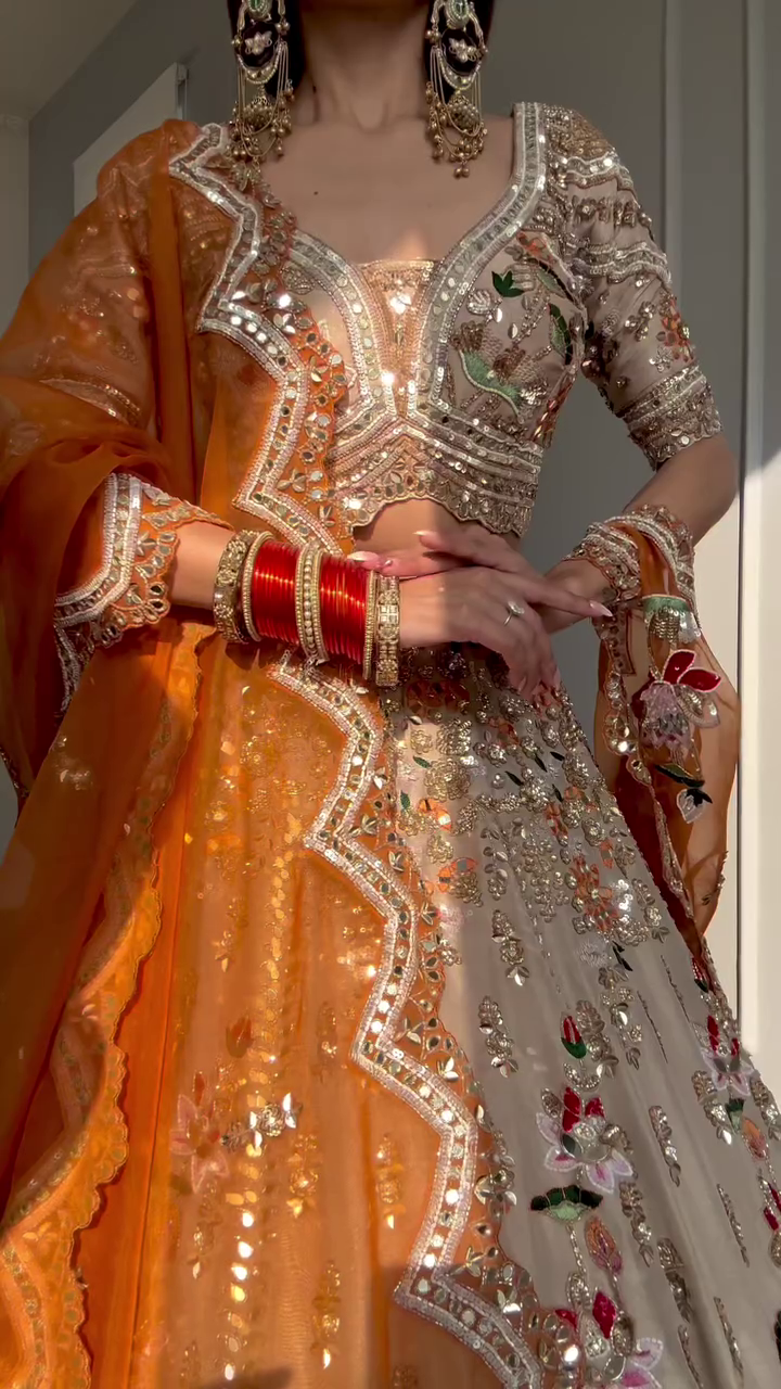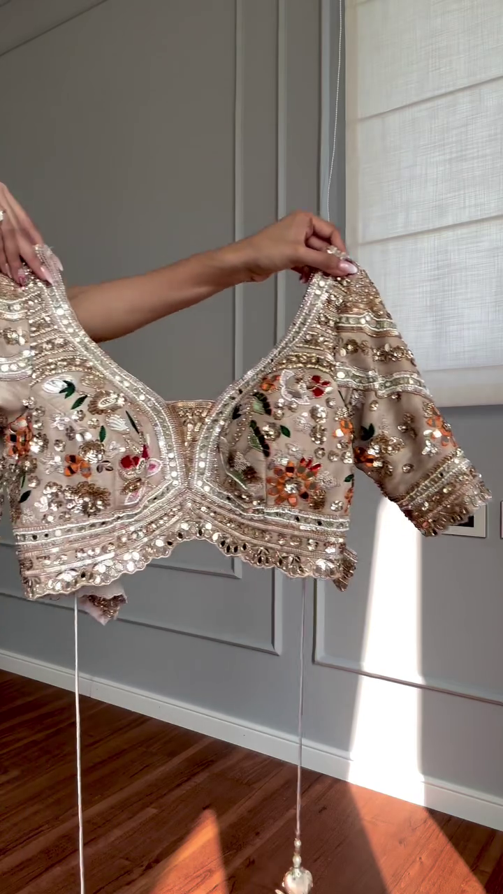 Each panel of this lehenga is brought to life with handcrafted mirror work, meticulously embedded across intricate zardozi and resham embroidery. The play of mirrors and threads creates a gentle sparkle that catches light from every angle, offering a mesmerizing shimmer during ceremonies or evening receptions.
