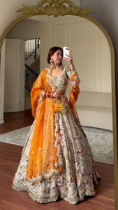 For a modern twist, brides can style it with a statement belt or a sheer embroidered dupatta draped asymmetrically.
